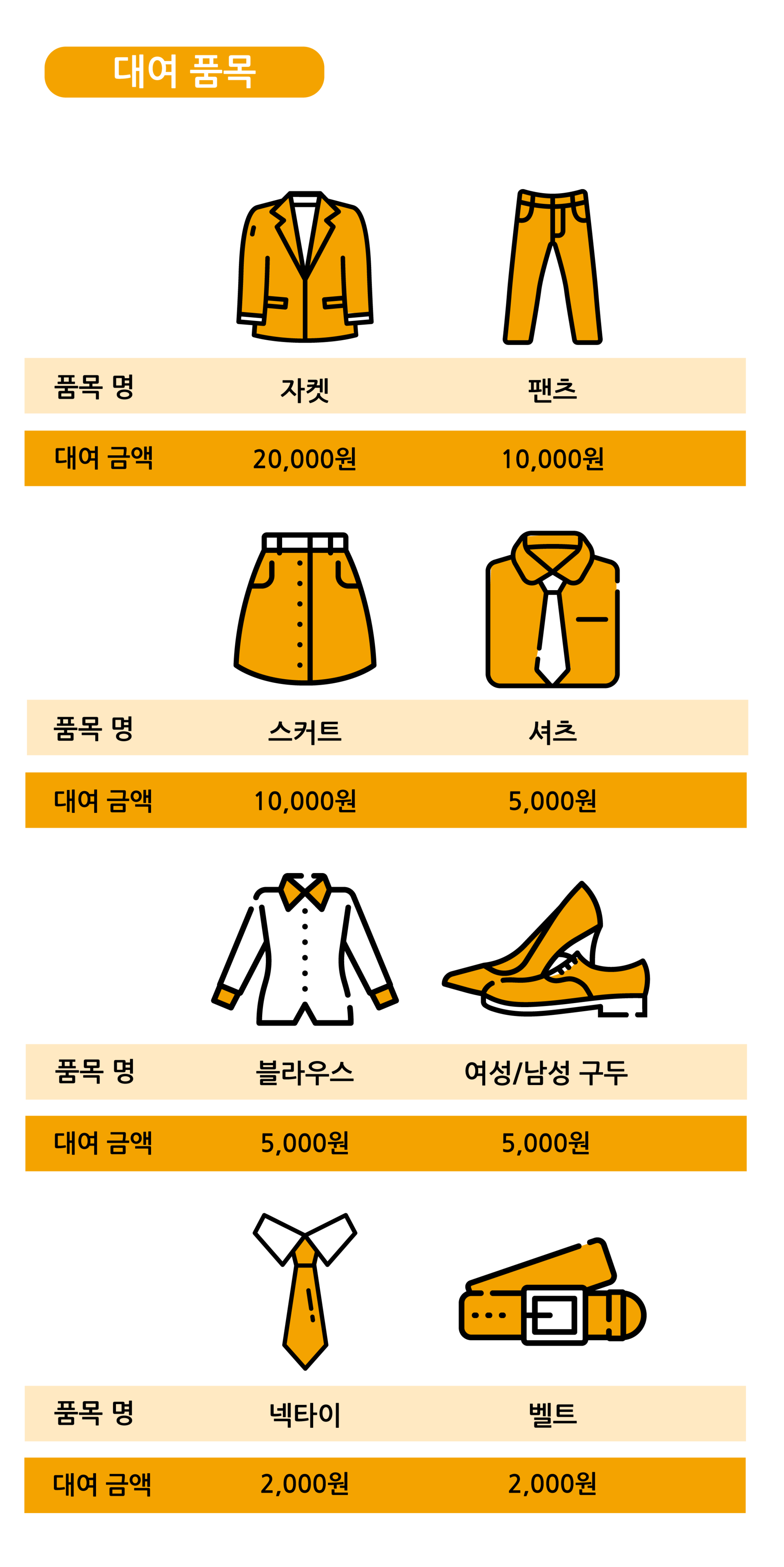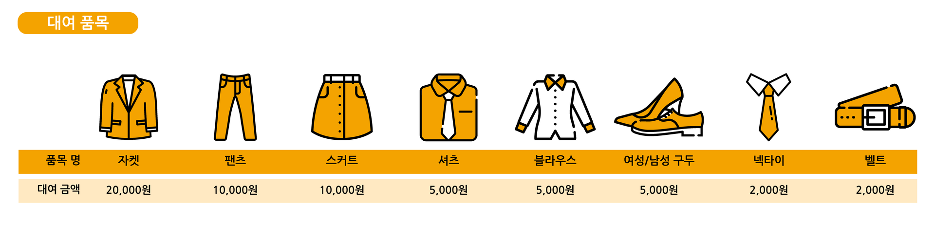 ※ 대여 연장/연체 시, 1일 기준 대여금액의 30% 추가 (넥타이/벨트는 1일 1,000원 추가)