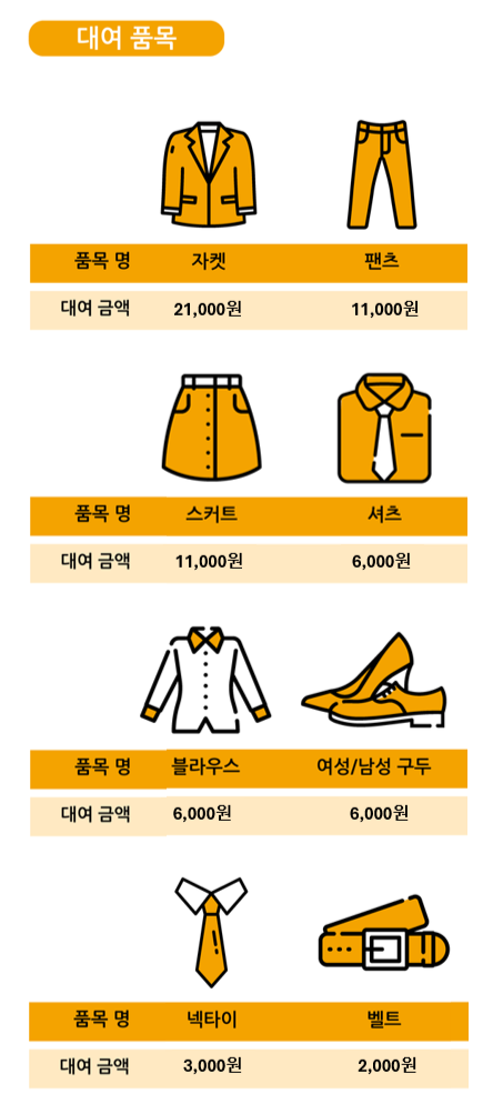 ※ 대여 연장 또는 연체 시, 1일 기준 품목별 대여 금액의 30% 추가 부과 (넥타이, 벨트는 1일 1,000원)