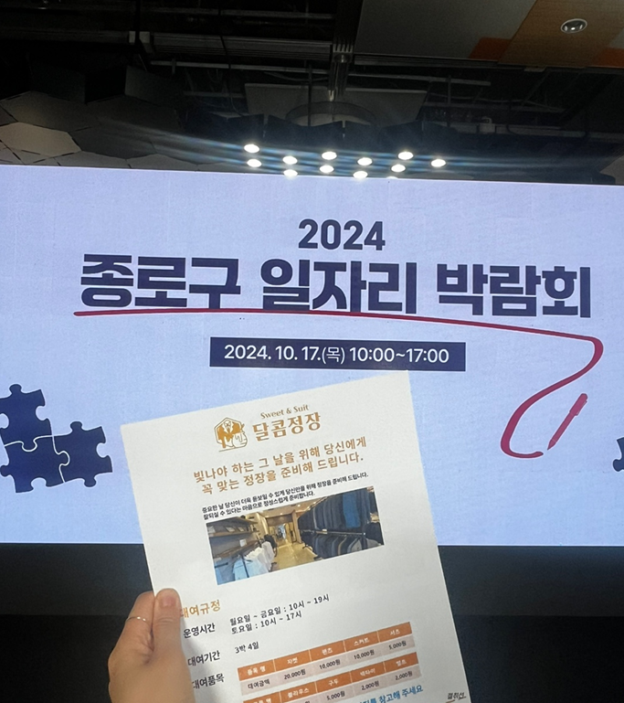 달콤정장(주식회사 제이로브컴퍼니)이 24년 종로구 일자리 박람회에 후원 업체로 함께 참여하였습니다.
